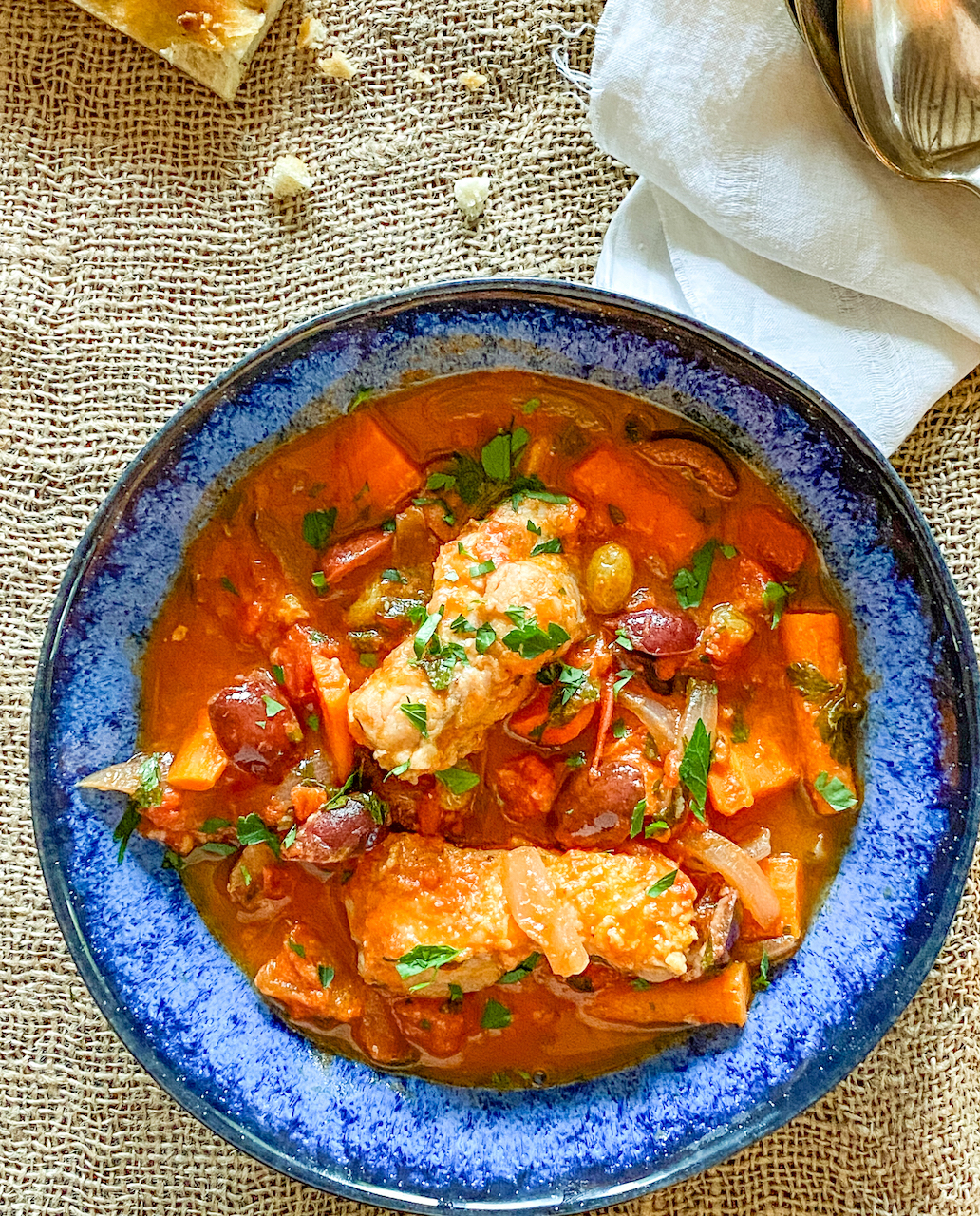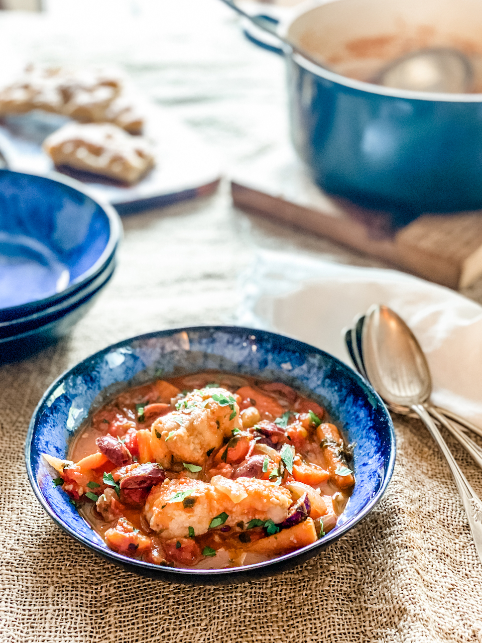 We started with the classic base of onion, garlic and tomatoes, added in some carrots that we had on hand to add a sweetness to the briny tomato broth, and then tossed in some olives, capers and raisins towards the end. We added in about a teaspoon of vinegar at the end to balance the acidity of the tomatoes. If you cannot find fresh monkfish, any firm white fish will do such as snapper, grouper or halibut. This recipe comes together easily for a weeknight and was a light, bright tomato broth that was delicious served simply with wonderfully crusty bread to soak up all the sauce and a light green salad. We hope you enjoy as much as we had making it.