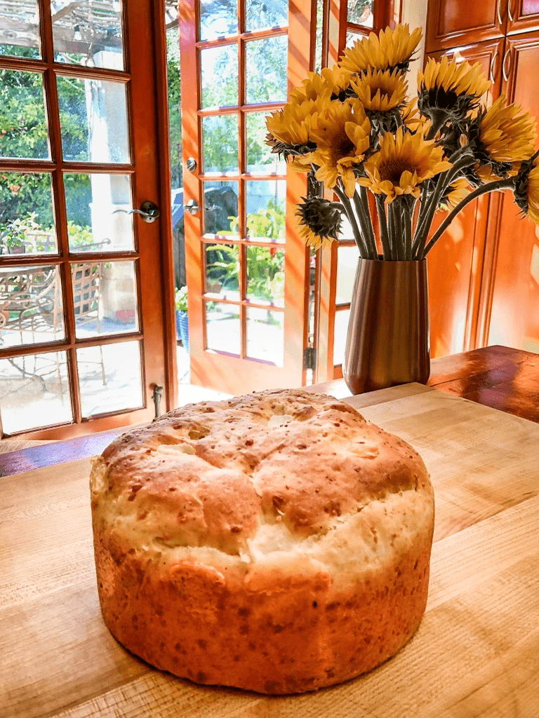 You can use an 8- or 9-inch cake pan or springform pan to bake the bread. If using a cake pan, line with cut parchment paper to make it easier to remove.