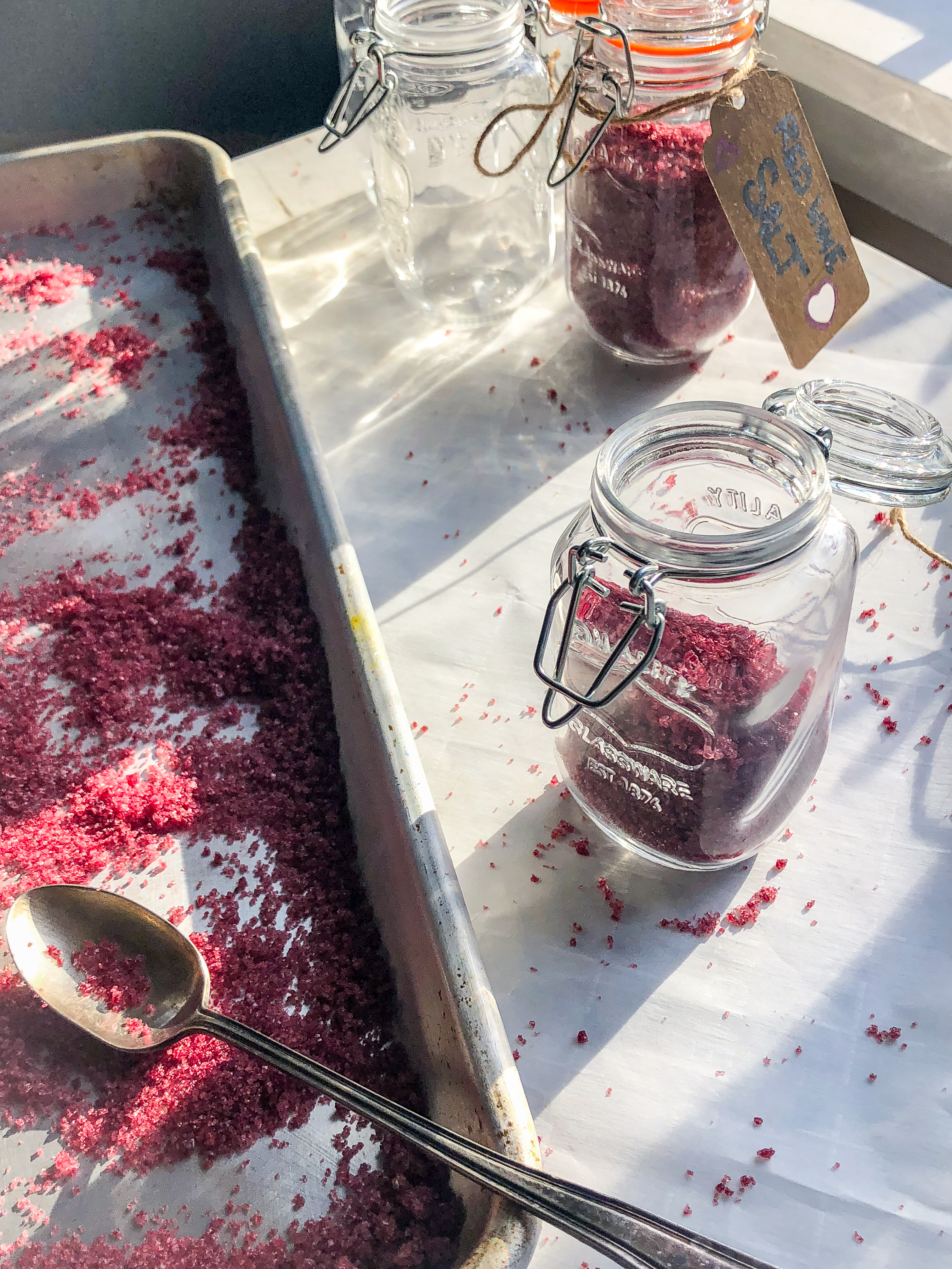 Spread the salt on a baking tray and allow to air dry for at least 24 hours. Stir the salt occasionally to prevent any sticking. Once dry, store in airtight jars.