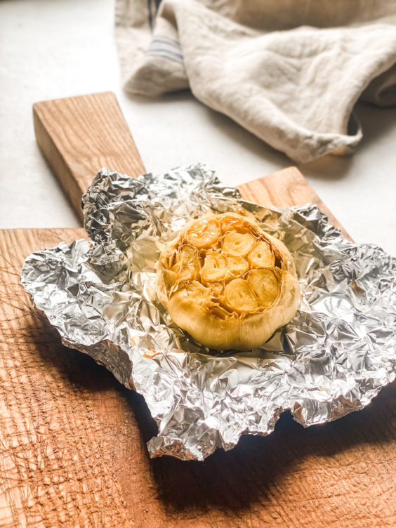 I frequently have roasted garlic in my fridge. I simply throw an extra head of foil-wrapped garlic, drizzled in olive oil and sprinkled with sea salt, in the oven while making another meal. Roasting garlic takes its taste to whole new level. The sugars caramelize while roasting, transforming it into a sweet, creamy head of goodness. You can then use it smeared over a toasted slice of bread. Stir it into mashed potatoes. Add it to salad dressings or dips. Or make this yummy focaccia!