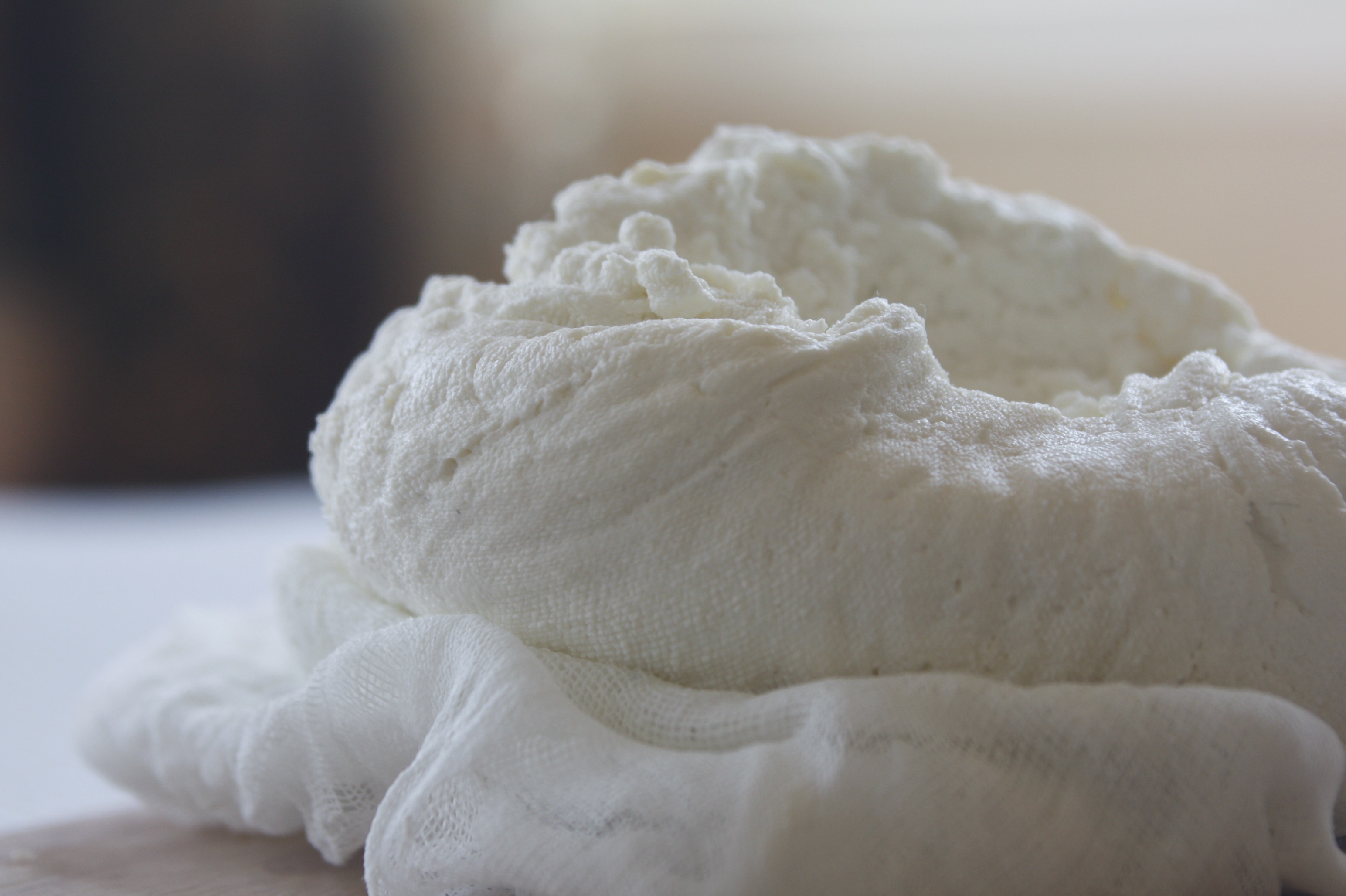 Bundle up the sides to the cheesecloth gently and tie. Using a rubber band or the knot in the cheesecloth, hang bag from faucet to allow to drain until the dripping has stopped and the cheese has cooled.