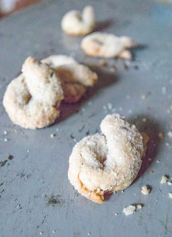 Form the cookies: Cover a baking sheet with parchment paper. Pinch off a walnut sized piece of dough and roll out to form a log approximately 4 inches in length. Bring together and overlap the two ends of the log and pinch to form a ring. Pour some sugar onto a small plate. Dip one side of the cookie only in the sugar and place, sugar side up, on the baking sheet. Cook until lightly browned, 20-15 minutes. Let cool and enjoy!