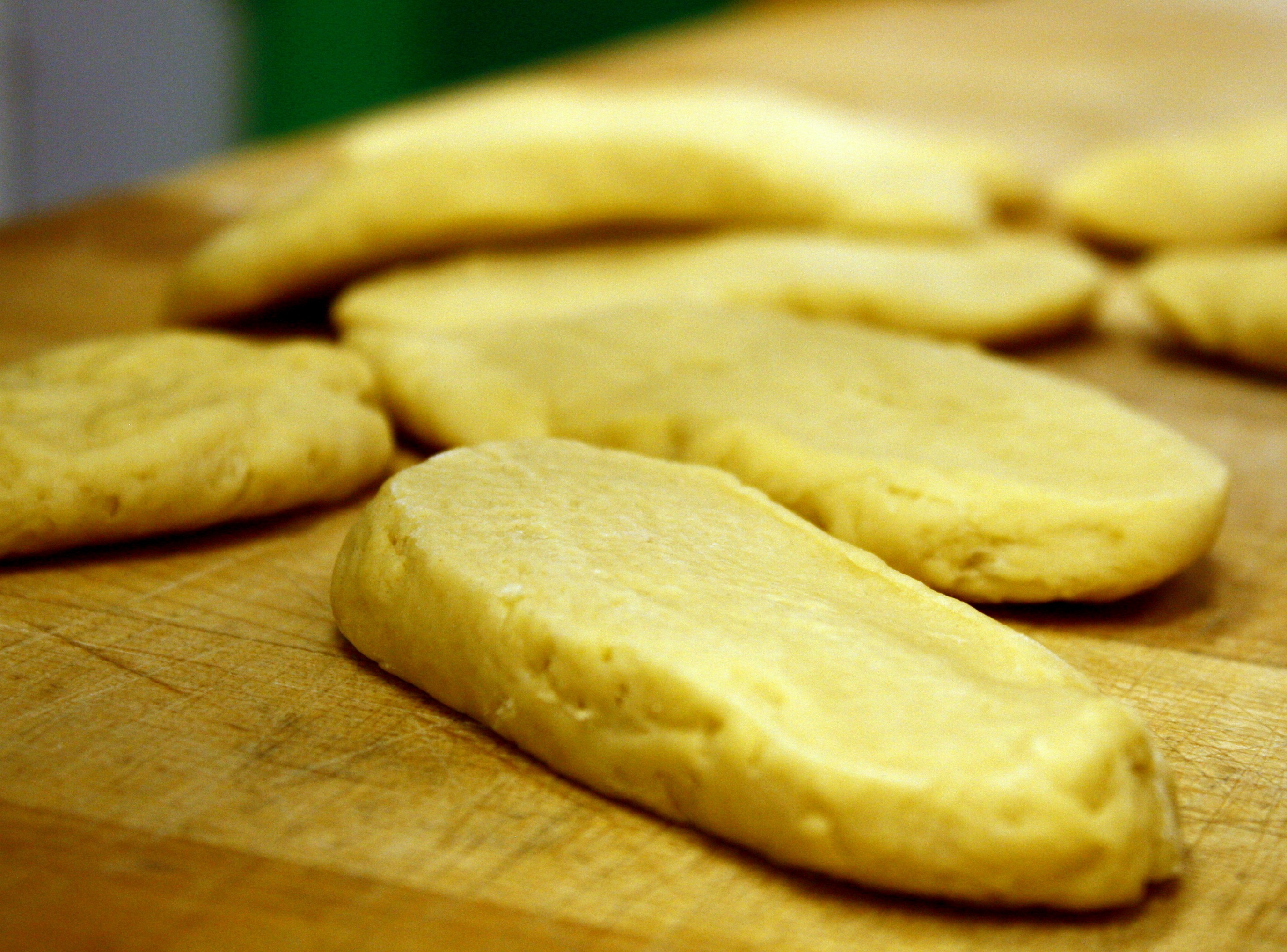 2. Add 5 cups of flour and work into a dough with your hands. You want the dough soft but not sticky. If the dough is too moist, add additional flour. Place the dough onto a board and continue to knead until the dough is soft and uniform – about 8 – 10 minutes. Cut the dough into sections (about 5) and continue to knead the dough, forming small loaves (see photo at right). Cover or wrap the dough in plastic wrap to keep it moist and allow to rest for 15 – 30 minutes.