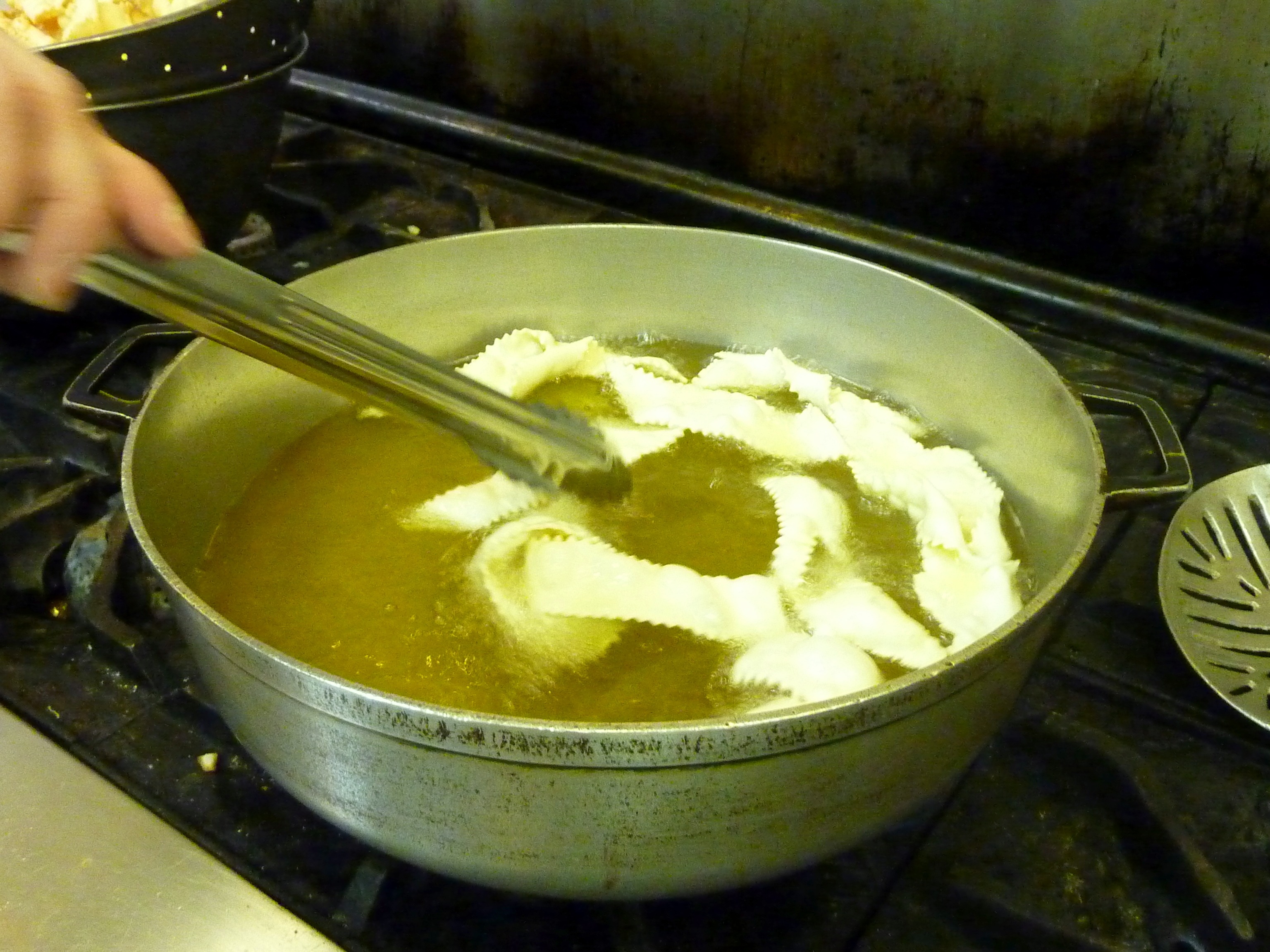 7. To be sure the oil is ready for frying, test fry a bowtie. If it puffs and floats to the top quickly, you know it is ready.