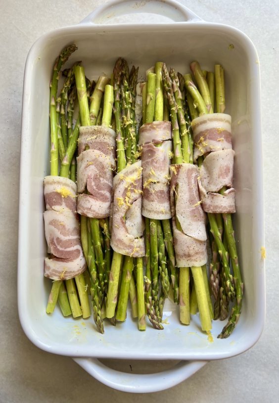 3. Loosely wrap 1 piece of pancetta around each of the bundles of asparagus. Place In a ceramic baking dish, approximately 7 ½ by 10 inches (does not have to be exact – use one large enough to hold the asparagus bundles and the eggs). Sprinkle with the lemon zest and a few grinds of pepper.