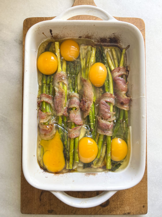 5. Gently crack 6 eggs on top of the asparagus bundles. Place the dish back in the oven and cook another 4-7 minutes until the eggs are cooked through to your liking.