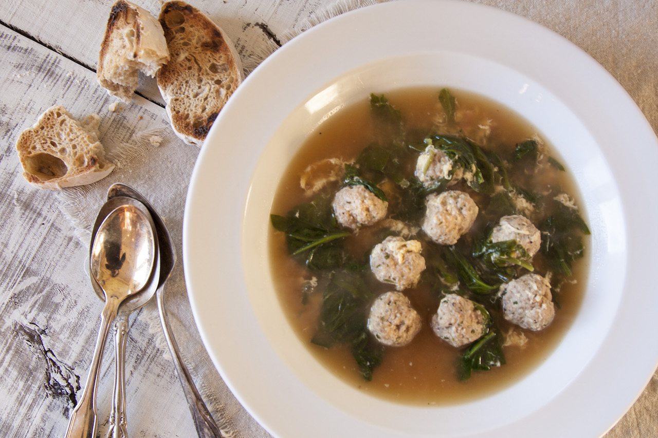 I have included two soups here. The first is a hearty porcini and wild mushroom soup. The preparation is little more than a quick sauté of some mixed mushrooms followed by a simmer in stock – hearty and satisfying. The second is a treat that takes me straight back to my mother’s kitchen – a simple soup made with broth, little meatballs, greens and eggs. My mother almost always had a pot of this waiting for me when I would return home for college visits in the winter months. She would use whatever greens were available and at times, forgo the meat or the eggs if she did not have available. To many Italian Americans, this soup is known as ‘Italian Wedding Soup’, although the origins of this soup are from a soup named minestra maritata, which translates to ‘married soup’, a reference to the fact that you are marrying the greens to the stock.