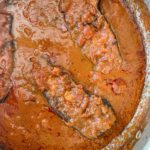 Simple stuffed eggplant, Sicilian style, simmered in tomato sauce – comfort food in a bowl!