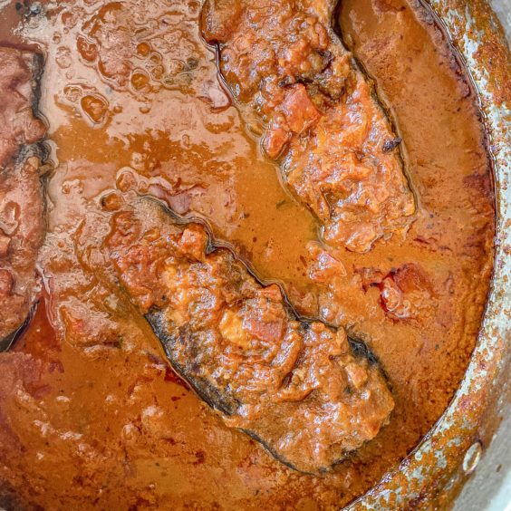 In a large frying pan, add a few tablespoons of olive oil over medium heat.  Once hot, add the eggplant halves, flesh /flour side down, and fry until brown, about 5 minutes. Once brown, add the eggplant halves to the prepared sauce.  When all the eggplant is added to the sauce, cover and allow to simmer over low heat until soft – about 25-20 minutes.  (I like to turn the eggplants occasionally as they are cooking.) Once the eggplants are soft and tender, remove to a serving dish and spoon the sauce on top. Serve with plenty of Parmigiano and crusty bread for dipping.  Buon appetito!