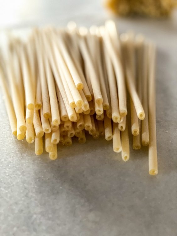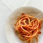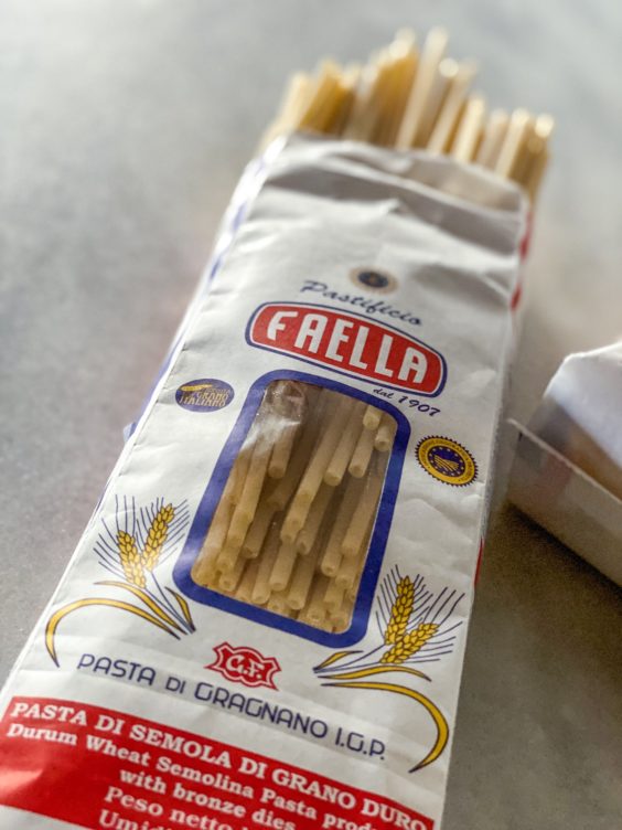 The soil in Campania, specifically around the infamous volcano, Vesuvius, is incredibly fertile. Waverley Root in his ‘The Food of Italy’ states that legend has it that Neapolitan sailors first brought the seeds of the tomato from Peru and they grew healthy and robust in the rich soil of Naples. Today, the San Marzano tomato reigns supreme. Doing all this research left me hungry to make a pasta dish made throughout the region – a very simple tomato sauce made from canned San Marzanos, simmered for a brief period with a garlic-infused olive oil and basil – allowing the magical and pure taste of the beautiful San Marzanos to shine through. I don’t always use extra virgin olive oil to cook but in this case, given how few ingredients make up the sauce and the quality of the other ingredients, I highly recommend breaking out the good stuff. Hot on the Neapolitan food trail, I also purchased pasta from Neapolitan Pastificio Faella established in 1907, turning out delicious pasta made from the wheat of Gragnano (the birthplace of Italian dried pasta) and the spring waters of the Lattari Mountains.