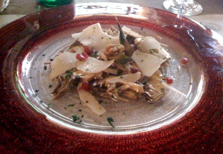 For my primi, I settled on a sliced artichoke and shaved parmigiano salad served in a vinagarette. Oh my. The artichokes were just a bit crunchy and were the perfect backdrop to the tanginess of the parmigiano. The sprinkled pomegrante seeds left me smiling as I sprinkle pomegrante seeds on everything I can findwhen they are in season. A recipe after my own heart and one certainly that I will be attempting at home now that spring is here and artichokes are in season!