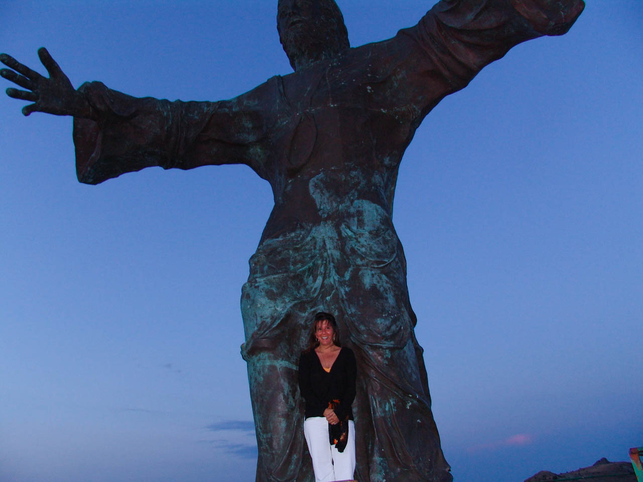 Danielle and I would frequently drive high into the mountains surrounding Mount Etna to visit his friends, Vito and Angela, that lived in the little village of Cesaro’. On the return trip, we would stop at a bakery late in the night to pick up a some fresh bread to eat on the drive back through the mountains. The bread would be warm and just out of the ovens – occasionally they would have fresh ricotta which we would slather on the bread as we drove. Oops – I digress for food again – back to the story. This is a photo when we visited the Statua Cristo Signore della Montagna, a 21-foot bronze statue of Jesus Christ with a 20 foot arm span. In 1996, a helicopter carried the 7000 pound statue to its perch on the highest peak peering over Cesaro’, nearby Pizzipiturro Mountain – approximately 4,000 feet above sea level. An effort which apparently took two aerial Christo spinning attempts to secure.